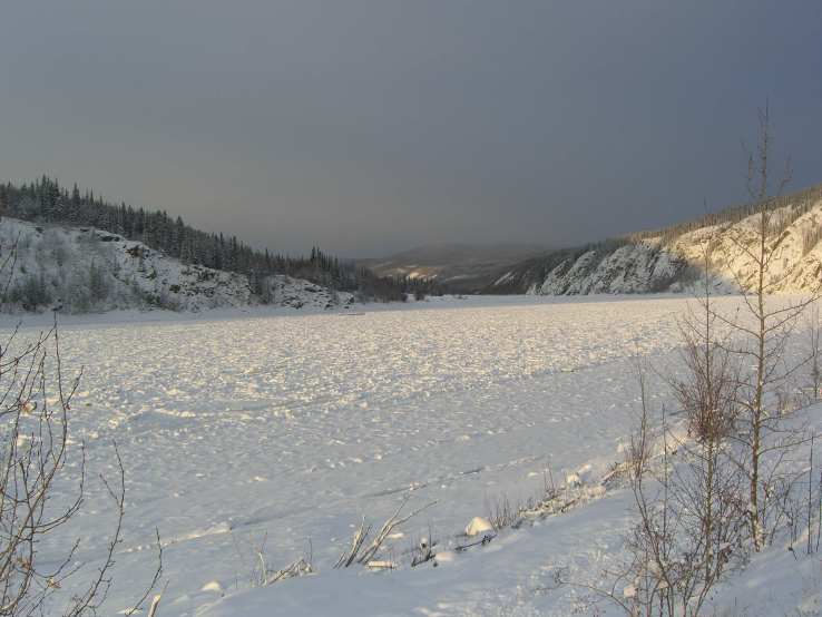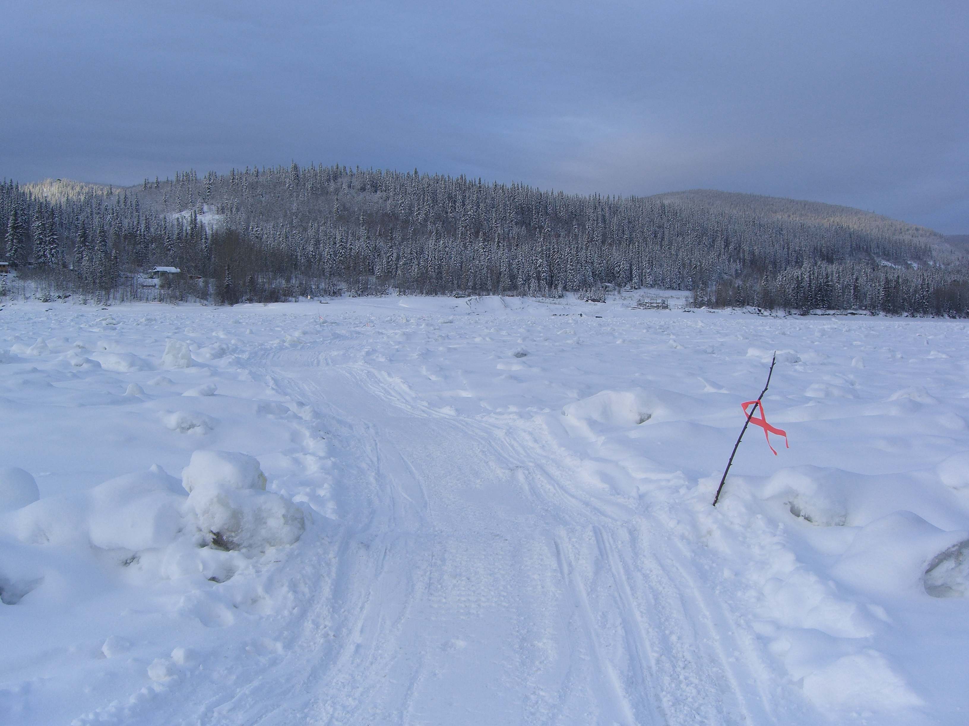 This is what it looks like today. The river looks completely safe, but the truck is causing caution. In -22 to -25 C weather, people are sticking to foot/ski/snowmobile/dog travel for now, along a “road” already marked out with orange flag tape by highway workers. (The ice road will follow those flags later.)
