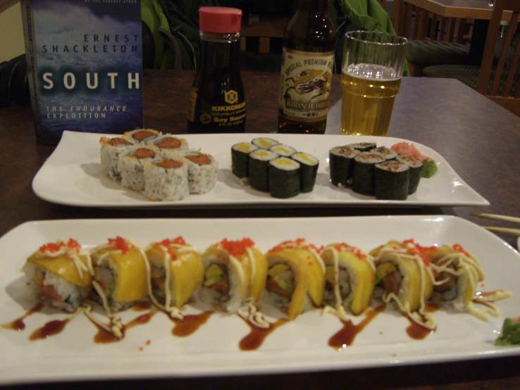 I took the book South out of my bag and immersed myself in its prose as I waited for my sushi to be prepared. The sidewalks outside were icy, but indoors everyone was jacketless. In another time, near another continent, Ernest Shackleton and his men were not so comfortable: