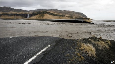 Iceland’s main highway, Route 1, is being dug up south of the glacier in an attempt to save Markarfljots Bridge from the flood water.
