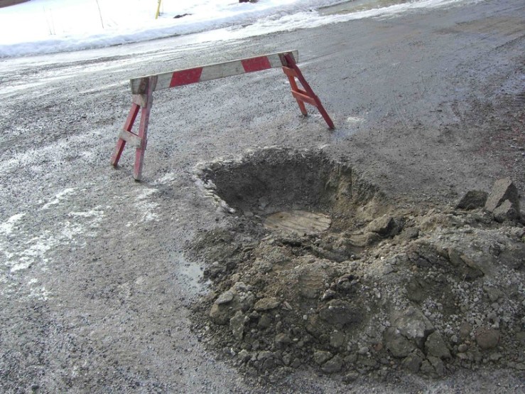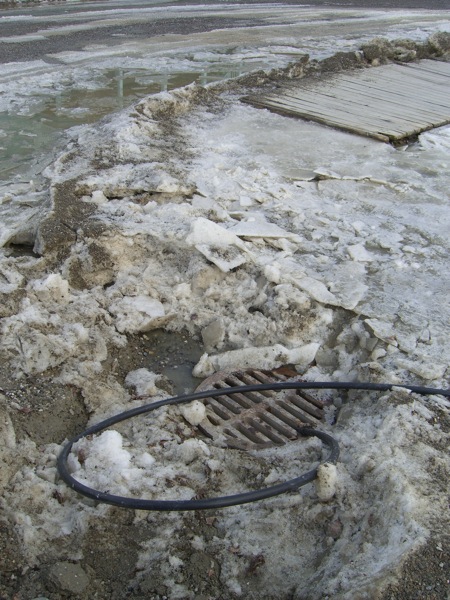 Earlier that day – March 28 – the City workers drove around in a backhoe and dug up the gravel and mud that had accumulated over the winter, even though the ground is still mostly frozen. This drain is waiting for its hydrant attachment.