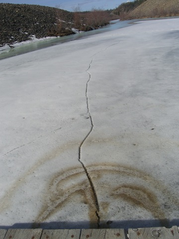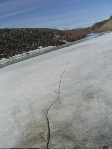 And last night, April 24, looking down the dredge pond into the 8:00 pm bright sunlight. The ice offers me an ice-star for bravery in playing.