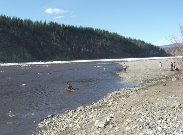 As for the view of the Yukon River near Dawson, today I saw dogs swimming near the shore – a sight unseen since last October. Ahhhh. The so-far slow thaw means the gravel beach is clear enough, and sun-drenched enough, for beer-drinkers to hang out too, while ice floes glow nearby.