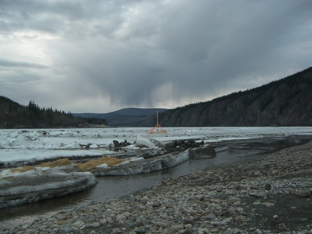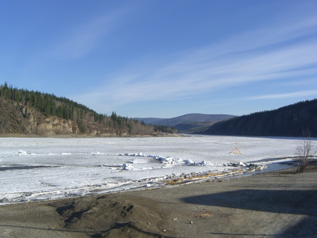 Back on this shore, with my more humble, closer-to-water view, I can’t believe the river didn’t break today. Have a look at why. The tripod in these photos is for the Ice Betting tickets – I will write a post explaining this tomorrow. For now, you just need to know that this view is taken toward the north end of Dawson (in contrast to the confluence photos I’ve been posting; both rivers are running smoothly at the confluence, with ice floe chunks along the sides).