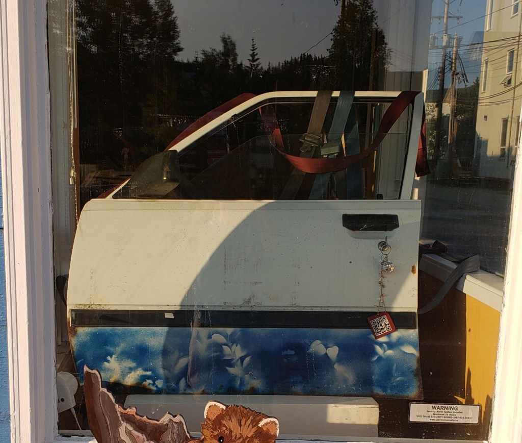 All components of the sculpture — car door, seatbelts, spray paint, tire, keychain parts and key — are salvaged materials.